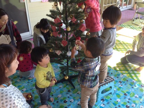 じゃーん☆★ オハナにクリスマスツリーが現れましたよ! 土台の部分からせっせとお手伝いしてくれたNちゃんとYくん。 ぼくもクリスマスツリーになってみたYくん。もじょもじょの帽子☆すてきでしょ? だんだんとみんなが集まって