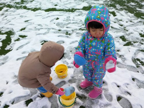 雪を見ると何だか嬉しくなってしまうのは、私だけでしょうか? ぃぇぃぇ。子どもも喜んでいましたよ♪ 6時半頃から降り出した雪は、瞬く間にオハナの人工芝を白く染めていきます。 これを見て、走り回りたくないわけがない!ですよね