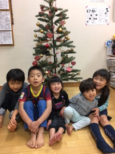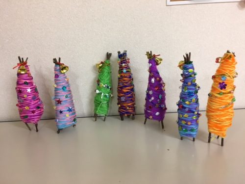 クリスマスまで、あと一週間ほど。 寒さも厳しくなり、年末の雰囲気が高まってきましたね。 オハナの子どもたちは毛糸を使って、クリスマスツリー作りをしました♪ 3本の木をゴムで留めて、中に新聞紙をつめて、周りを毛糸で巻いてい