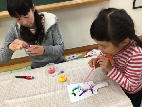 子どもの造形遊びの一つにフローイングというのがあります♪ フローは吹くという意味で、水彩絵の具を垂らした水滴をストローで吹き飛ばし、模様を作るというものです。 今月のオハナプレイパークでは、このフローイングでできた模様を