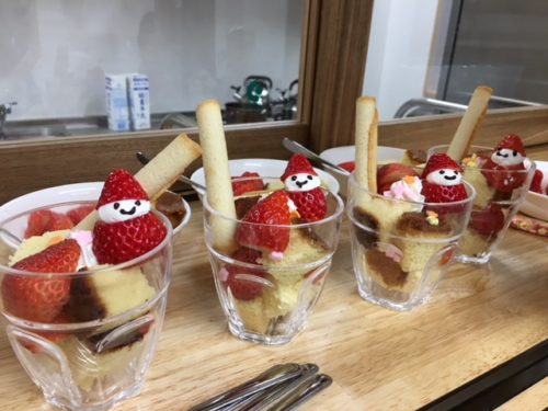 今日はクリスマス★ OHANAの給食も特別にクリスマスメニューとなりました!! 朝から忙しそうに、給食を作っていた千春さん。 みんなが外遊びから中へ入ってくる頃、ケチャップを赤いペンのように、何かを書いています。 出来上