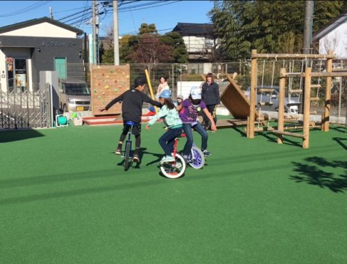 一輪車をOHANAで購入したのが、今年に入ってから。 まだ一年経っていません。 乗り方のコツを教え、少しずつ上達していった子どもたち。 今日は自分たちで一輪車のフォーメーションを考えて演技を見せてくれました。 先頭を走る