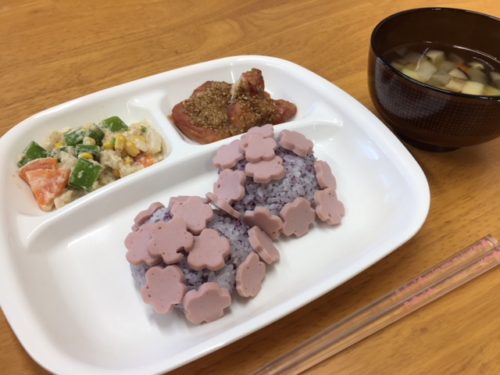 6月とえば梅雨、梅雨といえばあじさい‼ 今月のお楽しみ給食は紫陽花がご飯とデザートに変身です☆ 紫陽花の花はソーセージの型抜きです♪ ソーセージが大好きなEちゃん。 あっという間にお花がなくなり、ゆかりご飯