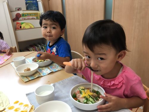 明日は七夕ですね。 OHANAでは七夕の気分を“味わって”もらうために、こんな給食を用意しました☆ 昨日のおやつではメロンパフェにお星さまがいっぱい☆ さわやかな味のメロンが夏らしく、お星さまが乗っているだけで“七夕気分