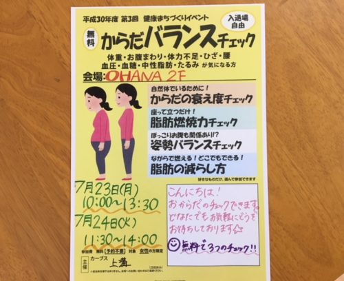 ☑ 体力が落ちた気がする ☑ お腹まわりが気になる ☑ 腰、ひざが痛い チェックがついた方は、からだのバランスが崩れているかも!? 心配な方、OHANAで からだバランスチェック […]