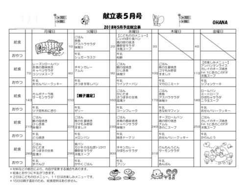 遅くなりましたが、5月の献立表をアップします☆ 4月はアップしませんでしたが、今年度は離乳食も作っています♪ OHANAクラスの子どもたちはモリモリ食べて、すくすくと育っています☆ みなさんもおうちのレパートリーの参考に