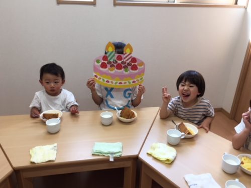 今日は5月生まれのお友だちの誕生日祝いケーキをおやつに、みんなで食べました☆ みんなに「何歳になったのー?」と聞かれて「5さーい!!」と自信満々で答えたTくん! 明後日で4歳になります♡(笑) みんなに『ハッピーバースデ