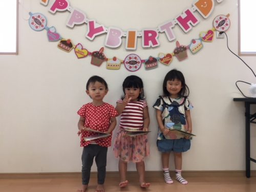 今日は5月生まれのお友だちの誕生会☆ 2歳になったお友だちと3歳になったお友だち♪ みんなで写真をパシャリ★ 上手にポーズができました! 今月の歌になっている『おべんとう♪』という手遊び♪ 子どもたちはみんなお気に入りで