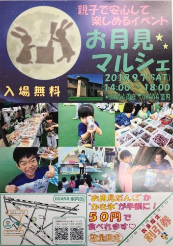 毎年、親子連れで賑わう、OHANAのお月見マルシェ、今年も開催します! 日時:9月7日(土)14:00~18:00 場所:OHANA園庭(雨天時:室内) 入場料:無料 対象:地域の方どなたでもご来場いただけます 出店者: