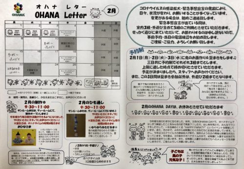 2月のOHANA Letter(OHANAパーク予定表)が出来上がりました! 緊急事態宣言中は3組限定、外遊び合わせて5組までの利用となります。 今まで以上に感染予防対策を徹底してまりますので、安心して遊びに来てください