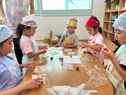 時間のある夏休みだからこそできる、手作りおやつのメニューということで、子どもたちからリクエストのあったクッキー作りを夏の終わりに行いました。 麺棒を使って、生地を伸ばすところからチャレンジ☆割り箸を生地の両端に置いて、ク