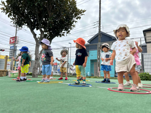 9月に入って、少しずつ始めたミニ運動会への取り組み。 まずは、室内で簡単なことから始め、あまり室内でやることに慣れる前に、園庭での取り組みに変えました。広々とした園庭は、解放感に溢れ、子どもたちの動きも大きくなります。