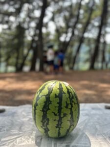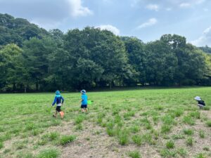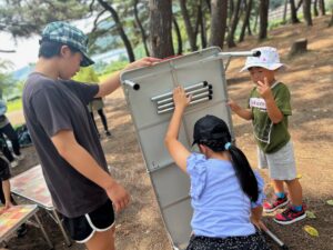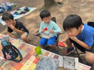 食事の準備は自分たちで♬お昼を食べる机や、すいか割りのすいかを冷やすためのミニプールを膨らませることなど、自分たちで全てやってもらいます。