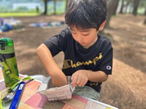 最近はライターやチャッカマンが主流で、マッチを使うことは少ないと思いますが、子どもたちにマッチで火をつける練習をしてもらいました。
