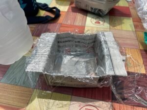 これは新聞紙で作ったお皿。箱型に折った新聞紙にサランラップをかけるだけで、使い捨てのお皿が出来上がります☆