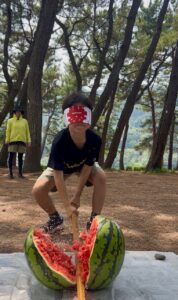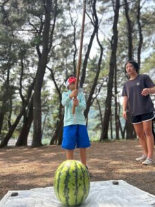 みんなで誘導して、スイカのところまで導き、最後は思いきり木刀を振り下ろして、パッカーン!