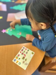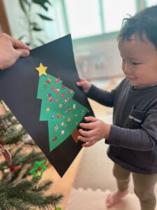 子どもたちはクリスマス前に、クリスマス制作として、クリスマスツリーを作りました。