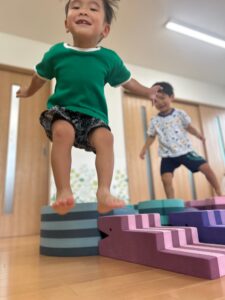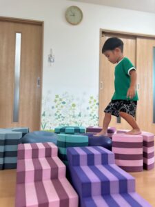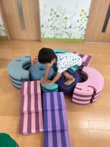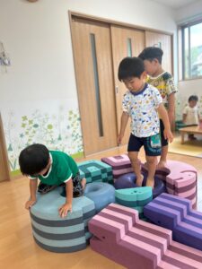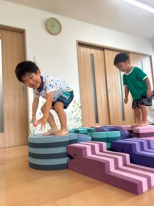 あえて、不安定さを出すことで2~3歳児は、足で踏ん張ったり、手を使ったりしながら玩具の上を渡っていきます。
