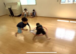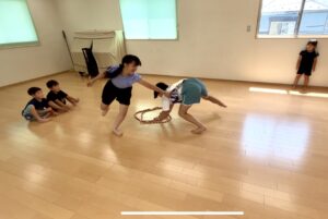 ずっと手をついた状態で、もう一人の子がハンカチを取りに追いかけてくるので、手をフラフープ中についたまま逃げ回ります!(笑)