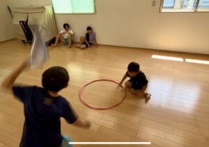 ハンカチをつけているこは、フラフープ(円)の中から手を離してはいけません!