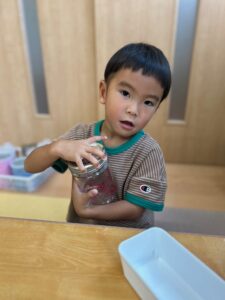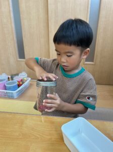 これは指先を使う遊びができる手作り玩具ですが、蓋をクルクルと回して開けなければ中のものが取り出せません。